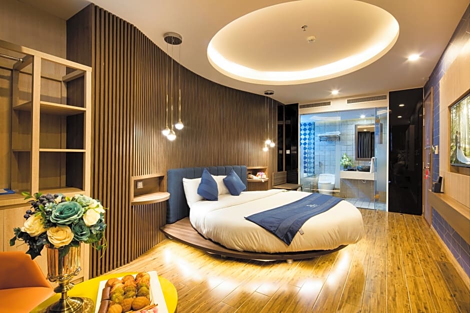 Fitted with a round bed, this suite offers stunning views of the city and sea through glazed windows and private balcony.